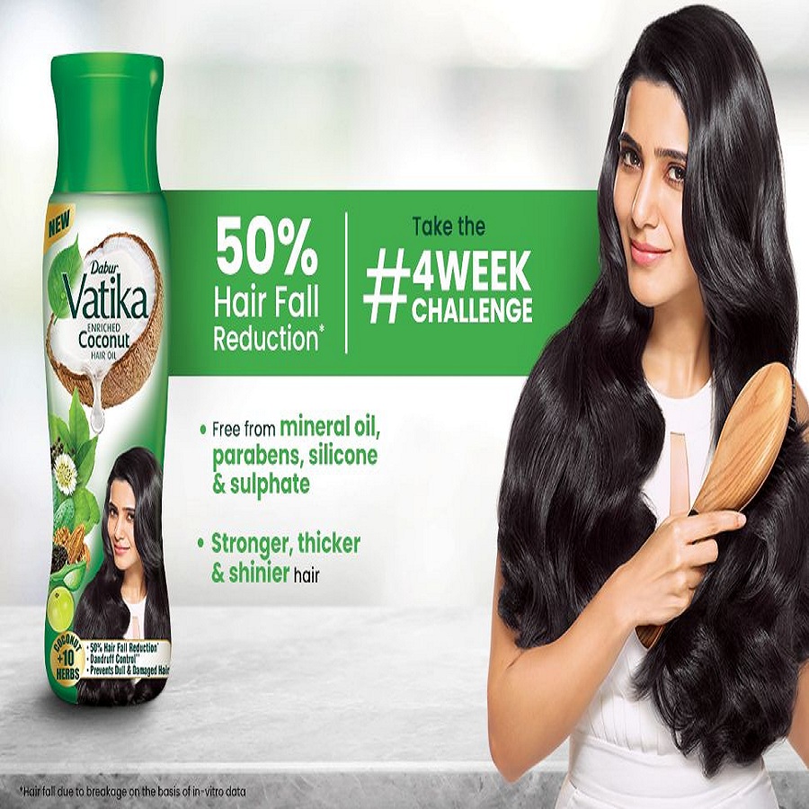 The New Vatika Enriched Coconut Hair Oil enriched with 3 ayurvedic herbs like Henna, Amla and lemon along with goodness of coconut. Processed by Tel Pak Vidhi, which helps in rejuvenating scalp health & strengthens hair from root to tip and only Vatika coconut Hair Oil is clinically proven to reduce hair fall up to 50% in 4 weeks.